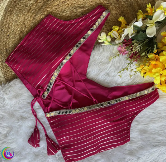 This backless blouse features beautiful mirror work that shines and catches attention. The striped pattern adds a trendy style. It has a backless design with a dori closure, that makes it easy to wear and adjust for a perfect fit.