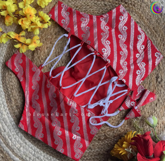 The zari woven work makes this red blouse perfect for weddings, parties, and festivals. It has a dori closure, so you can adjust the fit easily. The sleeveless style keeps you comfortable and adds to the modern look.