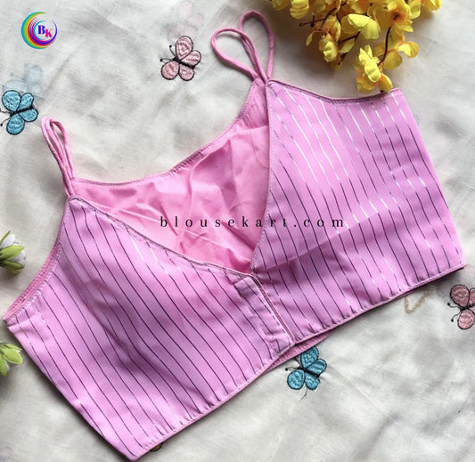 Regular price Rs. 379.00Regular priceUnit price / perRs. 699.00Sale price Rs. 379.00This elegant baby pink georgette sleeveless striped work blouse is a perfect mix of style and comfort, ideal for weddings, parties, and festive occasions. The boat neck and sleeveless design give it a modern yet graceful look. The silver-striped pattern adds a touch of glamour which makes it a must-have for special events.