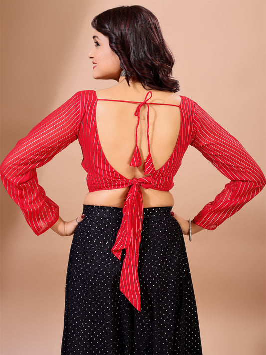 Regular price Rs. 499.00Regular priceUnit price / perSale price Rs. 499.00This stylish georgette blouse is perfect for weddings, parties, and festivals. It has a square neck and full sleeves, giving it an elegant and trendy look. The striped pattern adds a modern touch, and the pull-on design makes it easy to wear without buttons or zippers.